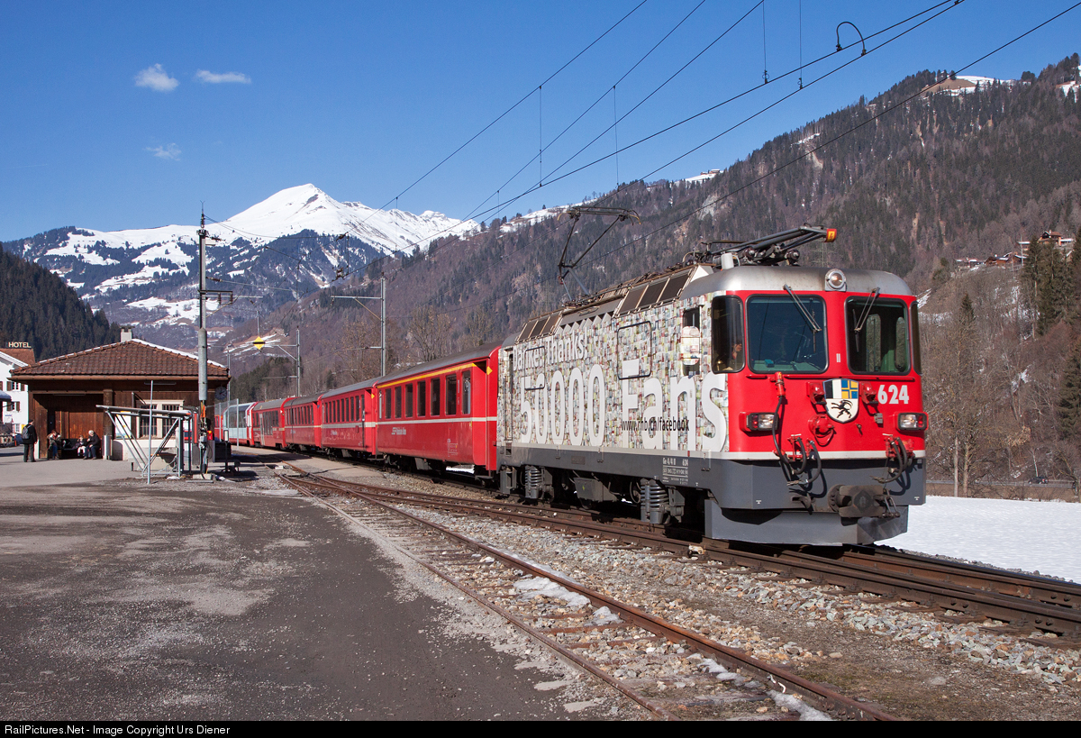 | Ge 4/4 II 624, painted in the publicity paint scheme for "50000 followers on facebook", is leading RE 1045 from Landquart to Davos Platz. |