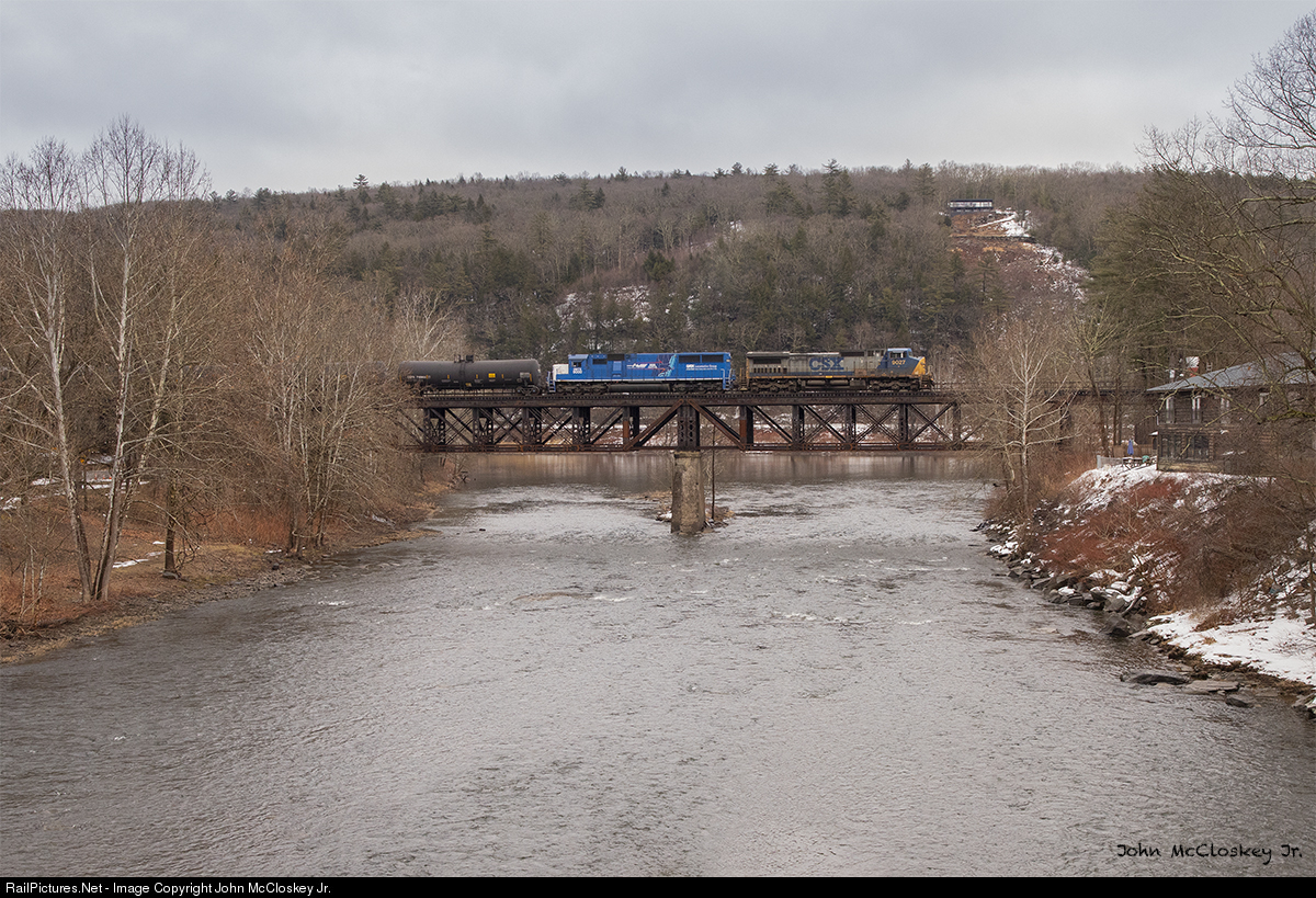 A rare daylight SU-100 along the CNYK Delaware Division is seen crossing over the Lackawaxen River in Lackawxen, PA with a borrowed CSX Dash-9 and GATX SD60 in P&W/VTR paint..