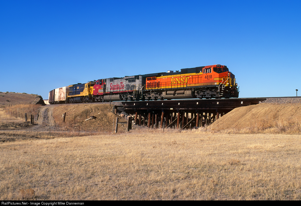 A colorful Burlington Northern Santa Fe freight heads south over a wood trestle approaching the town of Trinchera, Colorado, on February 27, 1999. The railroad siding located just east of town is spelled “Trinchere” on this line the runs from Trinidad, Colorado, to Amarillo, Texas.