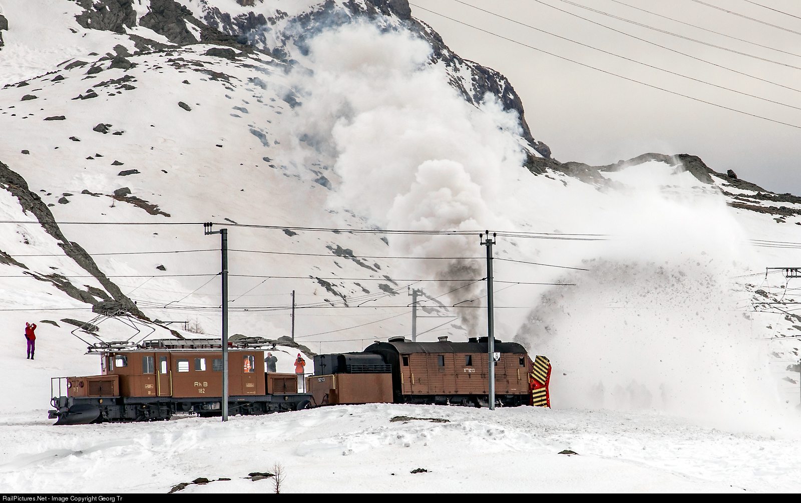 | Snow fighting demonstration event on the Bernina line of the Rhaetian Railway along the Lago Bianco on about 2250 meter a.s.l. The self propelled 0-6-0+0-6-0 steam rotary snow blower in action, shoved by "Bernina Crocodile" Ge 4/4 # 182. Right from the snow blower you can see some photographers/paticipants through the dust. |