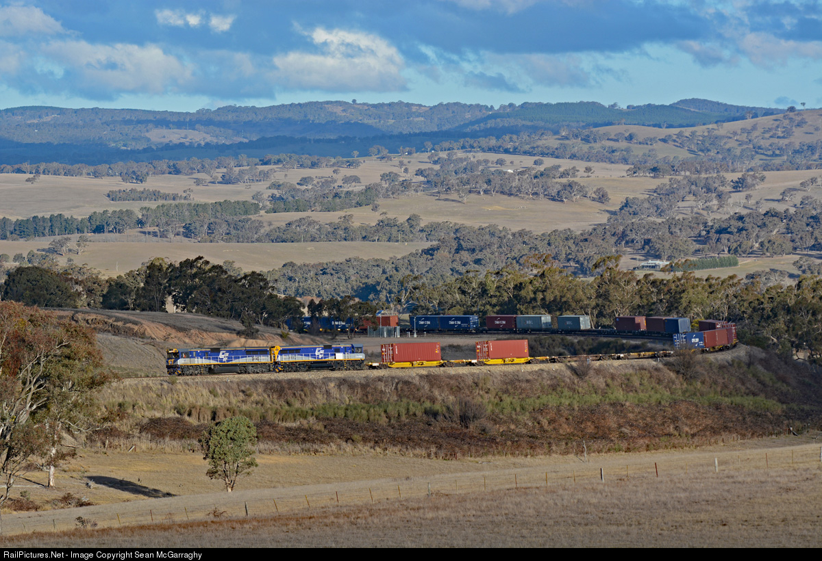 | Qube's containerised cotton service from Port Botany to Warren is powering hard through Bowenfels behind leased power CM3313 & CM3305 |