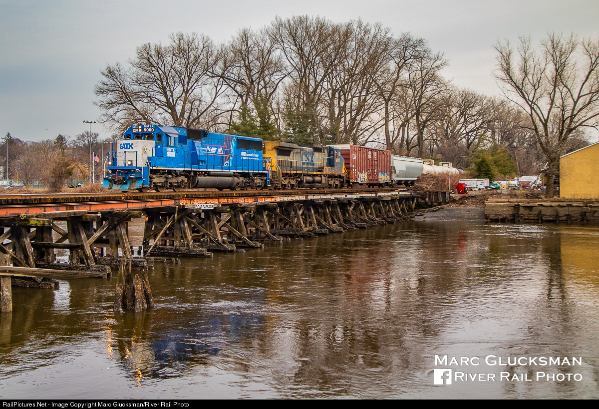 Blue and white on the yellow and black. GMTX/GATX 9000 is classified as an SD60, but has lived several different lives in its career. From EMD demonstrator to a term of lease with the P&W and Vermont Railways, and now out to help the New York, Susquehanna, and Western Railway, it has found a number of different homes. Seen here on Friday, February 22, 2019 crossing the Hackensack River into its namesake city leading with also leased CSX 9027, it adds yet another variety of color to the NYS&W's fleet.