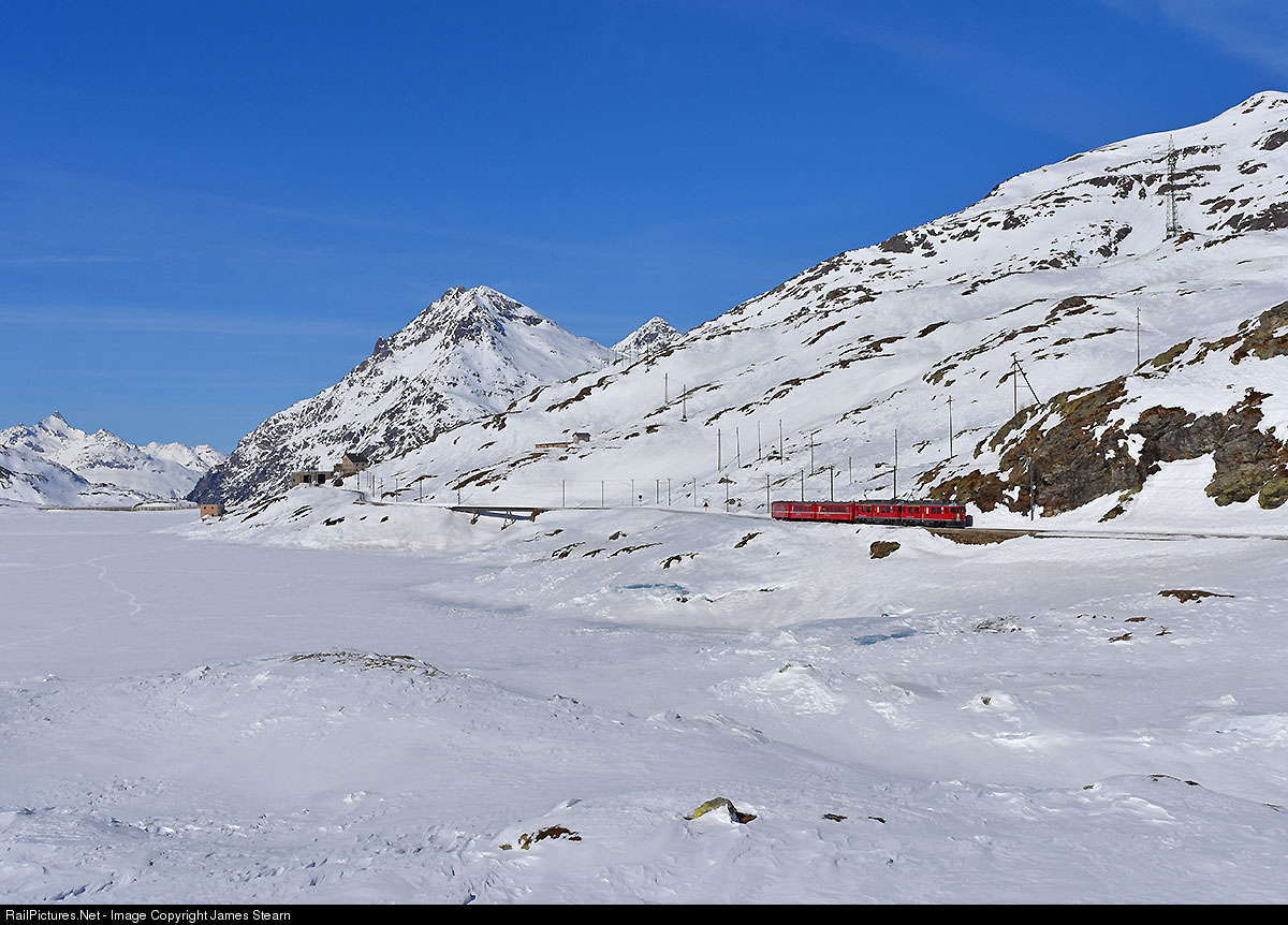 ABe 4/4iii railcars 54 and 52 haul three coaches along the frozen Lago Bianco with a St Moritz - Tirano service. In the distance is the small settlement at Ospizio Bernina, the highest station on Rhaetian Railways.