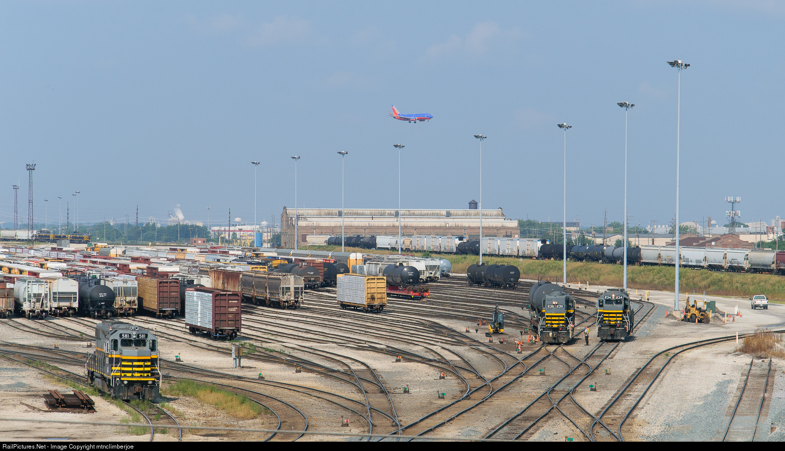 Three Belt Railway of Chicago yard crew work the east side of the BRC's Clearing Yard as a Southwest flight descends into the Chicago Midway Airport.