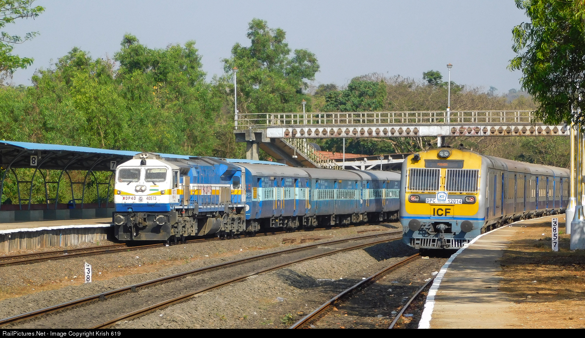 | KYN WDP4D Konkankanya express arriving at Pernem Railway station ICF Pernem Karwar Demu can be also seen in the view |