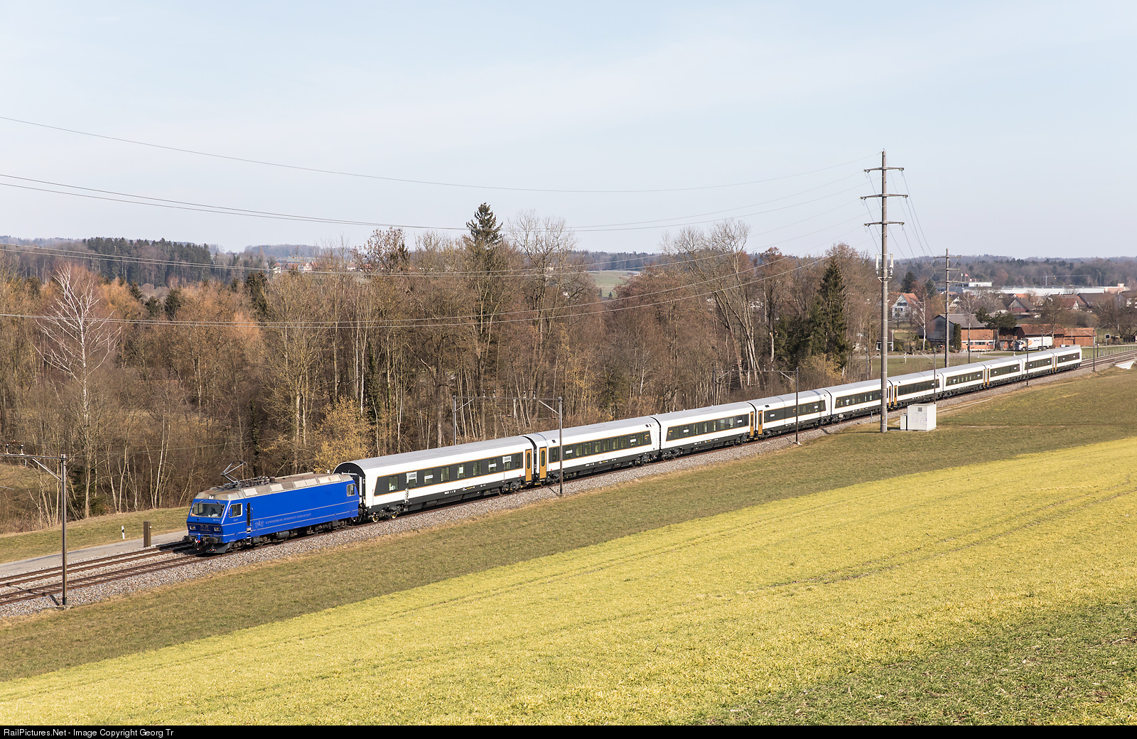 Re 456 # 111 of M-Rail (Müller Rail) in the SSG paint scheme is pulling train 69134 from Rorschach freight yard to Weinfelden Süd between Erlen and Sulgen. The train has 7 sleeping cars of type WLB, 1 dining car WR, 1 sleeping car type WLBb, 1 sleeping car type WLAB and 1 sleeping car type WLA for the Azerbaijan Railways (Azərbaycan Dəmir Yolları) ADY, built by Stadler Rail. The cars have gauge changeable bogies for1520 mm russian broad gauge in Azerbaijan, Russia etc. and 1435 mm standard gauge.