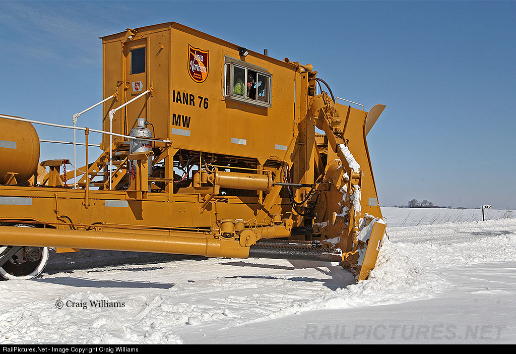 | The Iowa Northern went out for the 3rd time this week with their new Jordan Spreader. The 1st 2 times they did the Manly Sub around Nora Springs. Today's agenda was the Oelwein Sub from Dewar to Oelwein. They went to work at 4am at Bryant Yard in Waterloo and worked out to Oelwein by 2pm. Pushing drifts back on 19 miles of railroad helps track inspections, improves train movements, and has the railroad set up better for the next snow storm. Here the operator looks out to see how much snow the wing will push and looking forward obstacles ahead as they push snow near MP 342. |