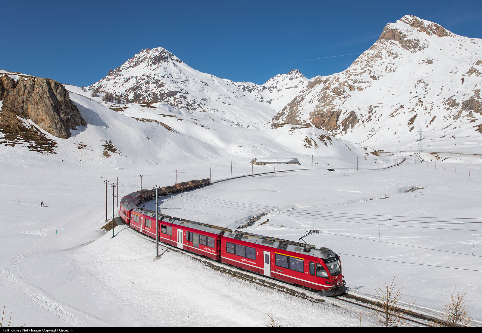 "Allegra" railcar ABe 8/12 # 3505 is pulling train 1633 from St.Moritz to Tirano over the Alp da Buond, between Bernina Lagalb and Ospizio Bernina. In the rear of the train are 6 empty fuel oil tank cars, running from Pontresina to Campocologno. In the background from left Piz Albris, Piz Pischa and Piz Alv. The track which is visible in this picture was built in 1934, to protect the Bernina Railway from threatening avalanches from Piz Lagalb. Till then, the track was along the Bernina pass road on the other side of the valley.