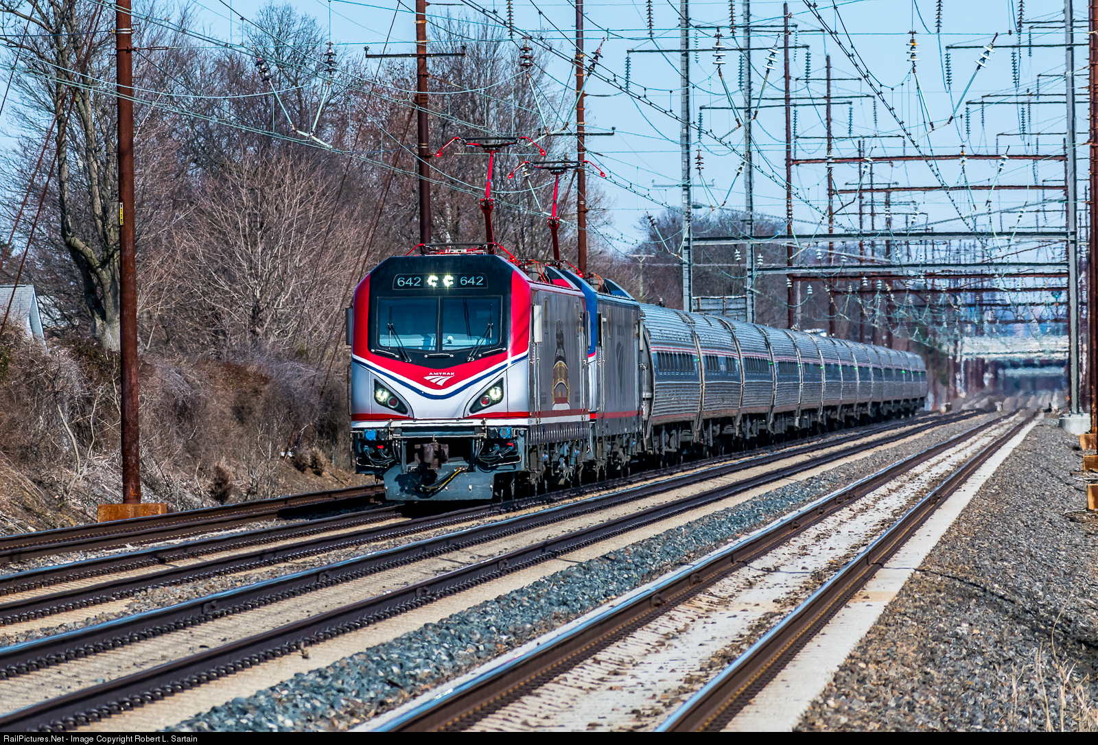 | The 82nd annual New Jersey Chamber of Commerce "Walk to Washington" charter train rolls southward to Washington, D.C. Amtrak's "Salutes Our Veterans" motor, ACS-64 642, leads 14 coaches and cafe cars with sister 629. This annual event allows New Jersey's business leaders and politicos to meet for an evening reception before returning home the next day. |