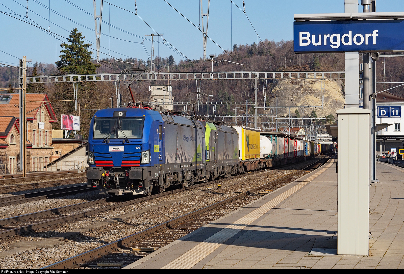 | Led by the Hupac-Vectron 193 496 and a BLS sister machine, the transit freight train No. 40379 with long-distance destination Mortara (Italy) rushes through Burgdorf station.