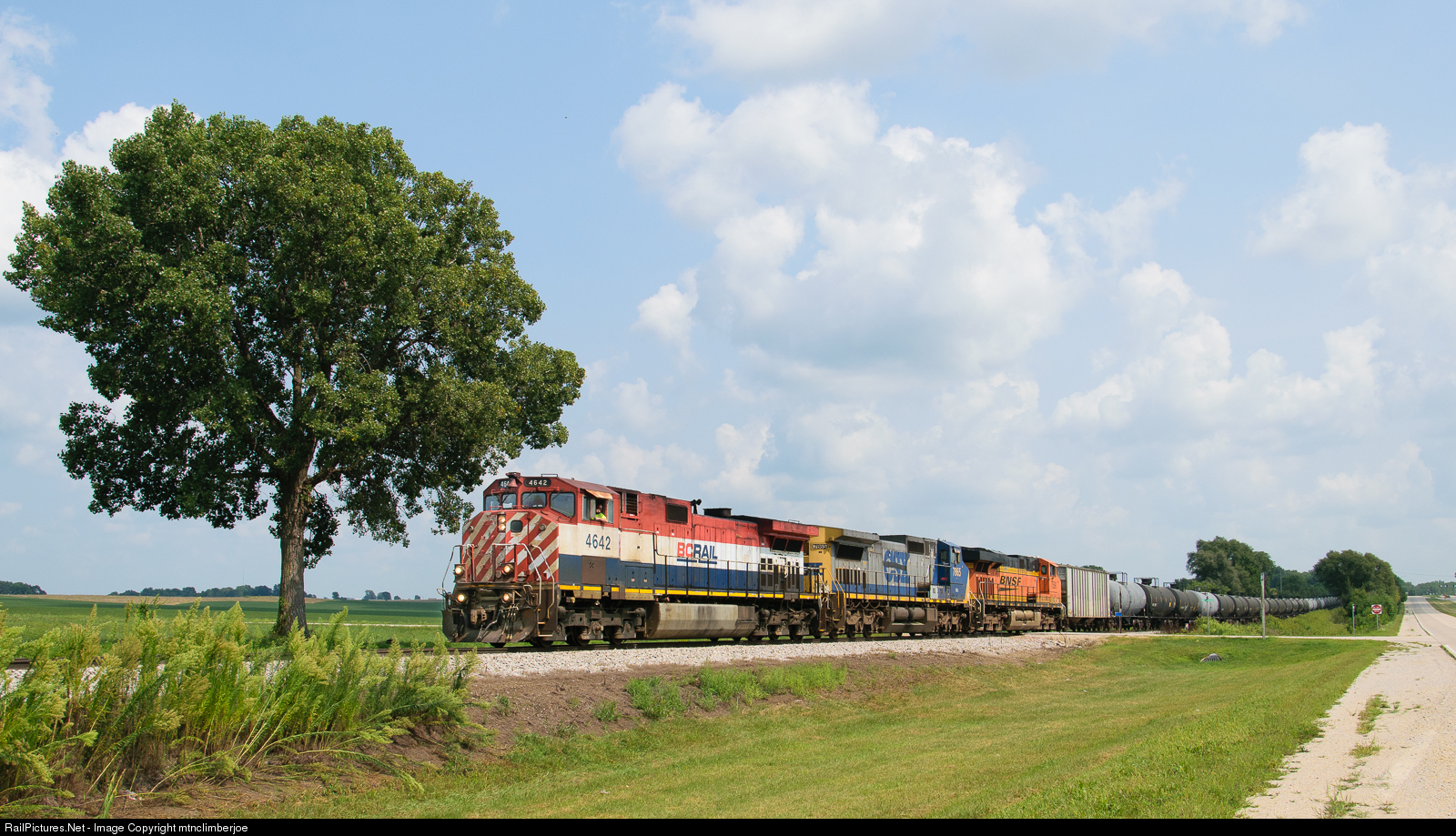 Canadian National ethanol train U705 passes by a big old oak tree as they make their way into Waterloo with a eclectic lashup led by a C44-9WL still wearing BC Rail colors.