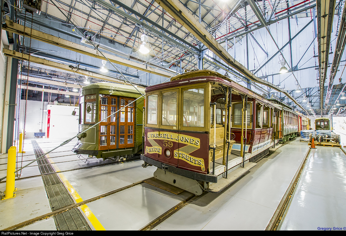 MUNI 59, a San Francisco Cable Car, sits inside of New Orleans RTA's Carrollton Transit Station Trolley Barn along with some other vintage trolleys. Built by the J. Hammond Car Company in 1906, MUNI 59 served San Francisco for decades before being sent to New Orleans as a trade for one of their Perley Thomas Streetcars. Notice how the car sits sideways because of the difference in track gauges between the two systems. |
