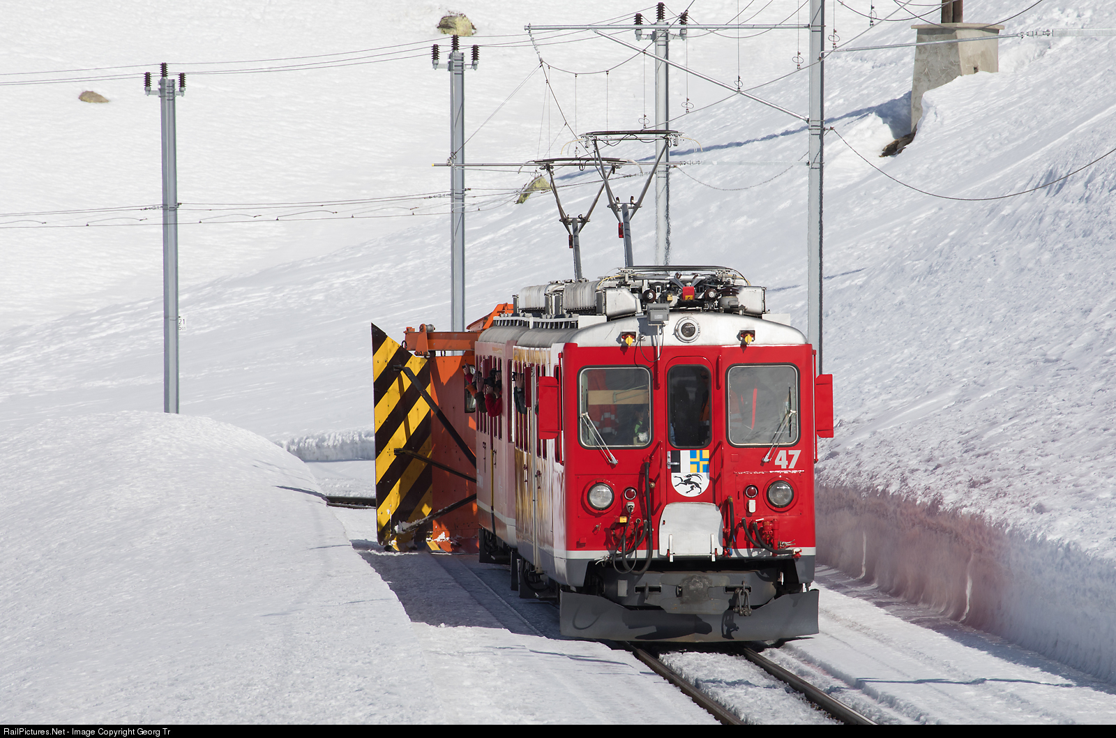 Snow fighting demonstration event on the Bernina line of the Rhaetian Railway. The railcars ABe 4/4 # 47 and not visible # 46 in multiple traction are pulling the snow scrapper Xk 9132, which has the cutting plates opened to estimated about 5,2 meter width. The maximum is 3 meter both sides from the track axis, so a snow channel of 6 meter width is created. The snow is deposited in the middle of the track, so it can be throwed away by the following steam rotary snow blower Xrot d # 9213. The participants of the event are taking pictures of the following Xrot d # 9213 from the windows of the railcar.