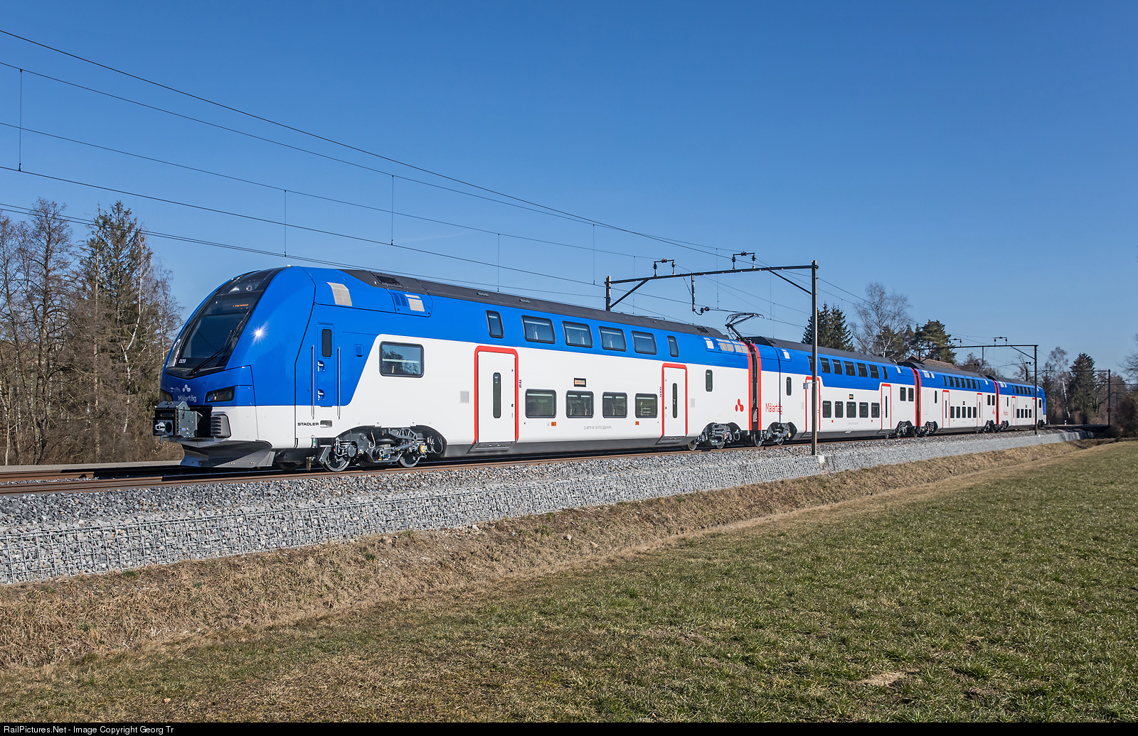 Test run from Romanshorn to Sulgen of the doubledeck Intercity train for the swedish AB Transitio, ER1 701 # 009, for service of Mälab (Mälardalstrafik AB) under the brand "Mälartåg". Transitio ordered 33 of this 200 km/h trains from Stadler Rail in 2016 for the lines Örebro – Eskilstuna – Stockholm – Uppsala (Svealandsbanan), Hallsberg – Katrineholm – Stockholm (Sörmlandspilen), Norrköping – Nyköping – Stockholm (Nyköpingsbanan), and Sala – Västeras – Eskilstuna – Katrineholm – Linköping (Uven).