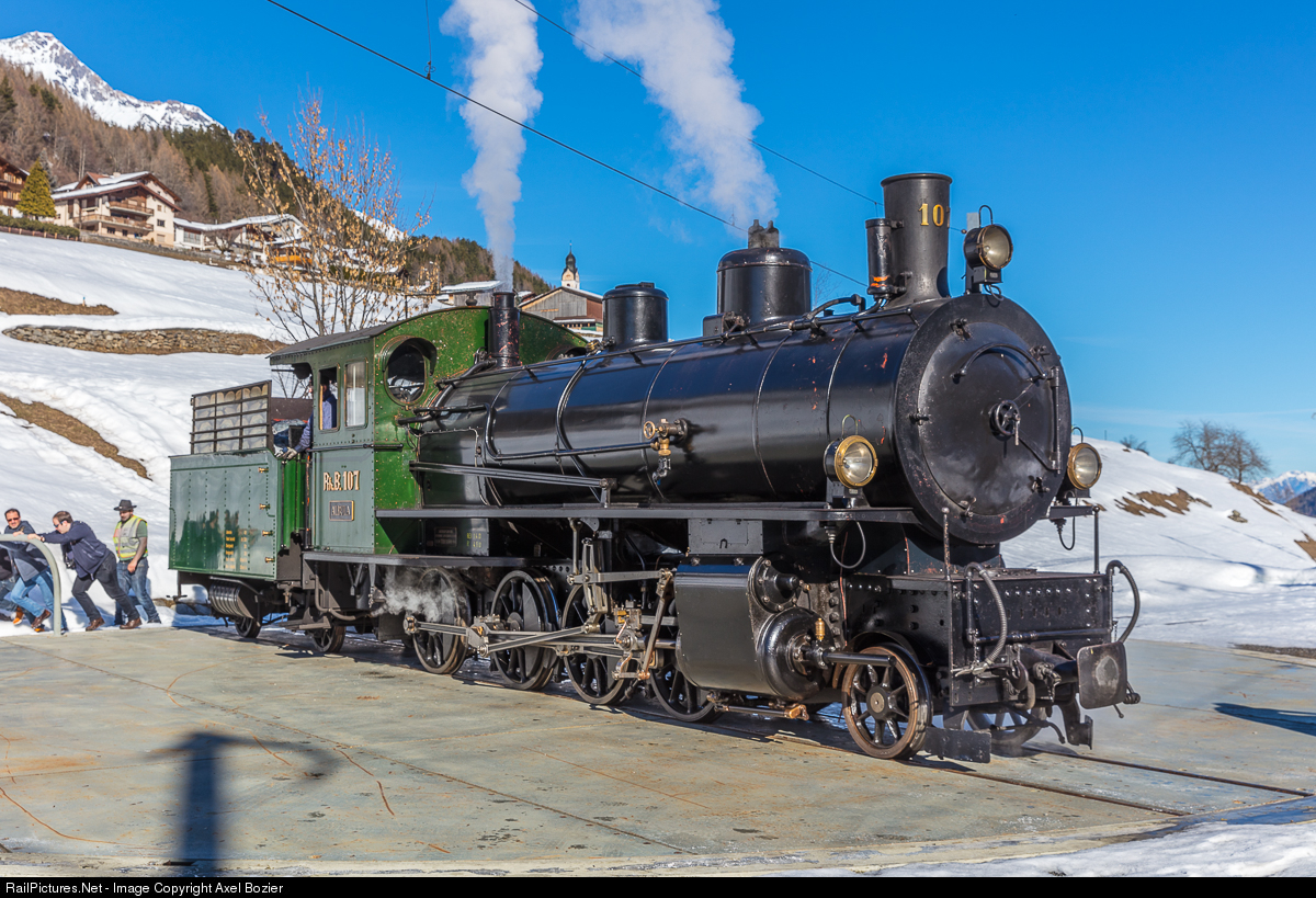 A portrait of "Consolidation" 2-8-0 steam locomotive G 4/5 #107 "Albula" (built by SLM in 1906) of the Rhaetian Railway RhB on the turntable in Sumvitg-Cumpadials.