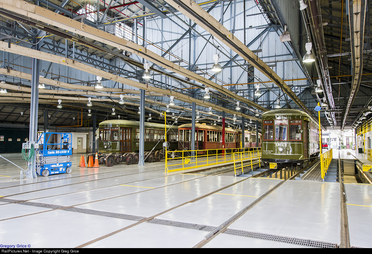 New Orleans RTA streetcar #963 sits on one of the pit tracks at Carrollton Transit Station Trolley Barn awaiting inspections.
