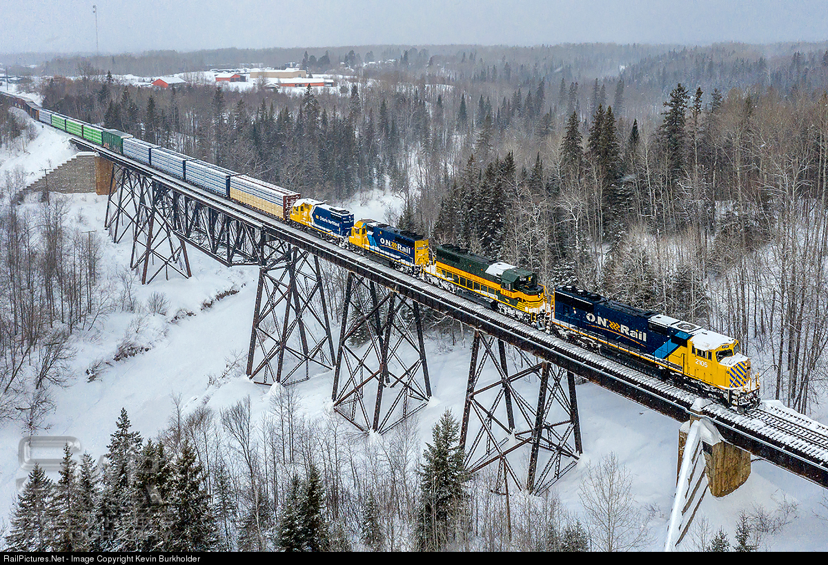 Ontario Northland Railway put together a 4-unit, 4-model, and technically 4-scheme consist on the March 2, Englehart to North Bay, Ontario train 214. Leading the consist is SD75I 2105, heritage-painted SD40-2 1730, GP40-2 2202, and GP38-2 1809, as it crosses the Blanche River in Englehart, Ontario.