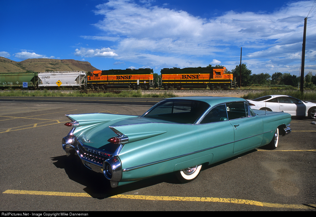 On August 18, 2005, BNSF’s Golden switch trundles eastbound along West 44th Avenue out of Golden, Colorado, and passes a stylish 1959 Cadillac parked in the lot of a local bar. Leading the local, BNSF No. 2800 was built as Chicago, Burlington & Quincy GP30 No. 973 in May of 1963, and was later rebuilt as a GP39M by Burlington Northern. The Caddy was built four or so years earlier. Both still retain classic lines produced by the styling department of General Motors.