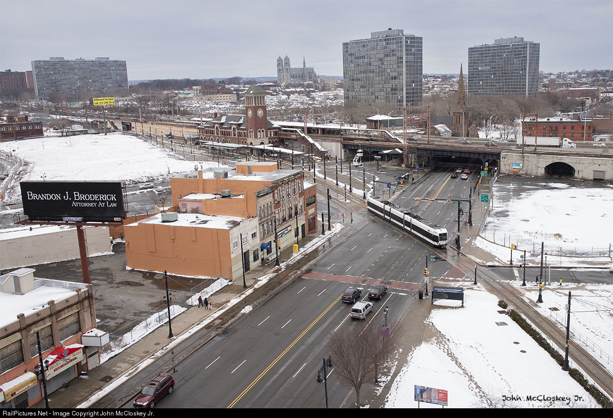 NJT's Newark Light Rail is seen crossing University Ave. as it arrives at the Military Park Station in downtown Newark right next to the railroads Newark Broad Street Station along the Morris & Essex/Montclair-Boonton Lines.