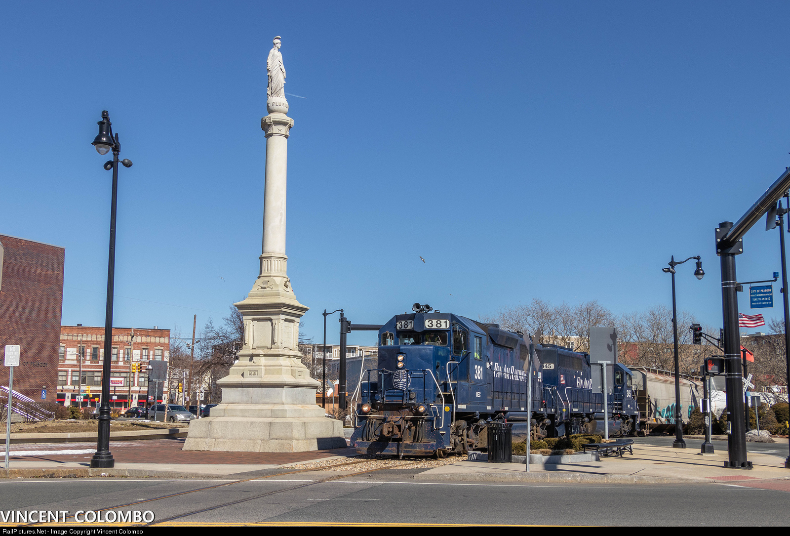 | Pan Am train BO-1 with MEC 381 and 345 cuts through Peabody Square, causing all sorts of confusion for motorists. As if the intersection isn't confusing already, the addition of an unexpected train track running straight through town adds to the mess. The train is running from Boston to Peabody today to service Rousselot. |