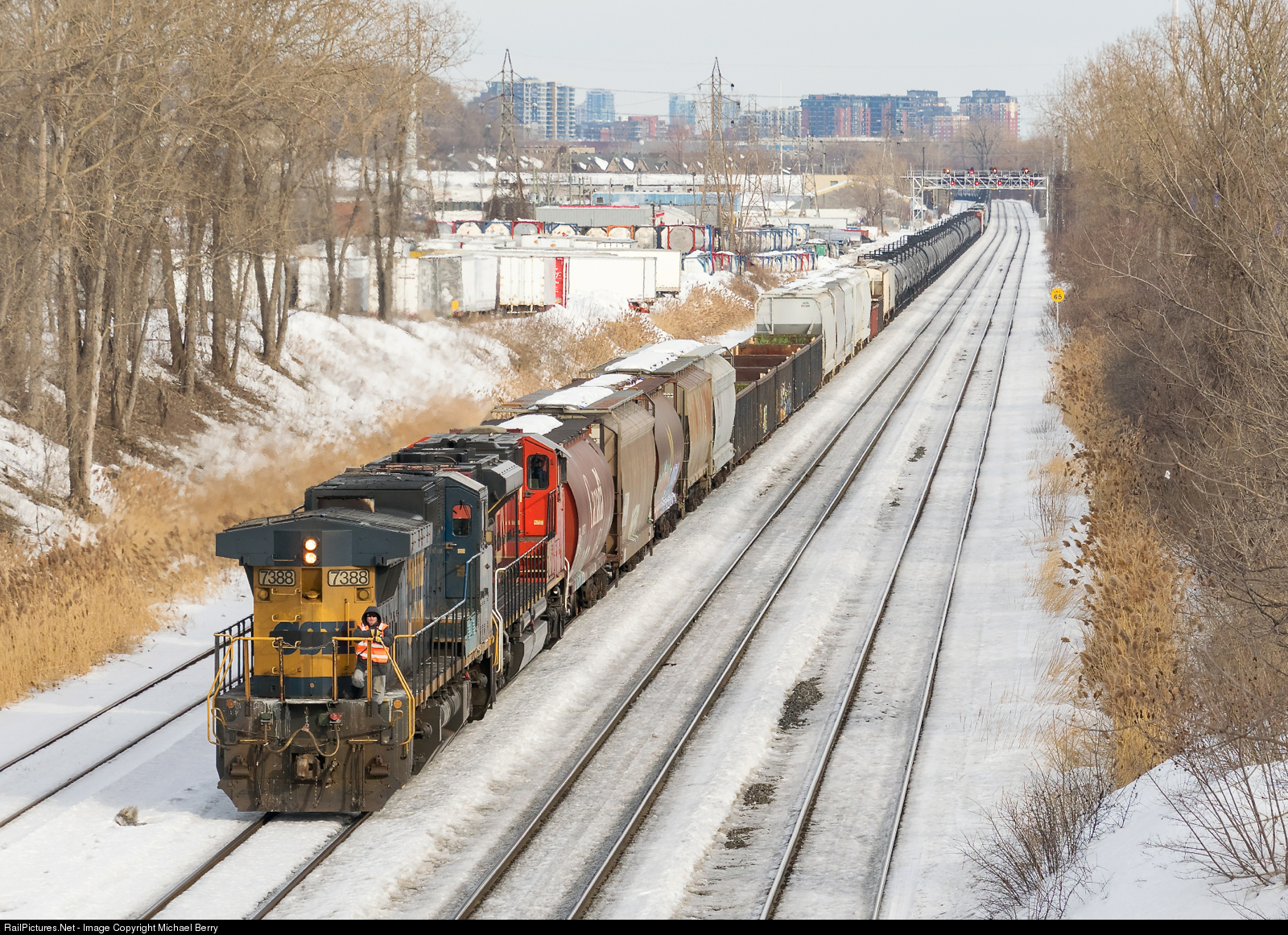 | Long hood forward to Taschereau. CN X321 is about to enter Taschereau Yard to wye their power, after running from Southwark Yard with GECX 7388 and CN 8902, both running long hood forward. |