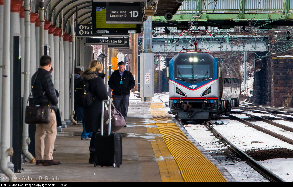 Next to Arrive on Track 1: Amtrak's Vermonter, Train 56, crosses over onto Track 1 at the Trenton Transit Center to make its station stop as passengers prepare to board.