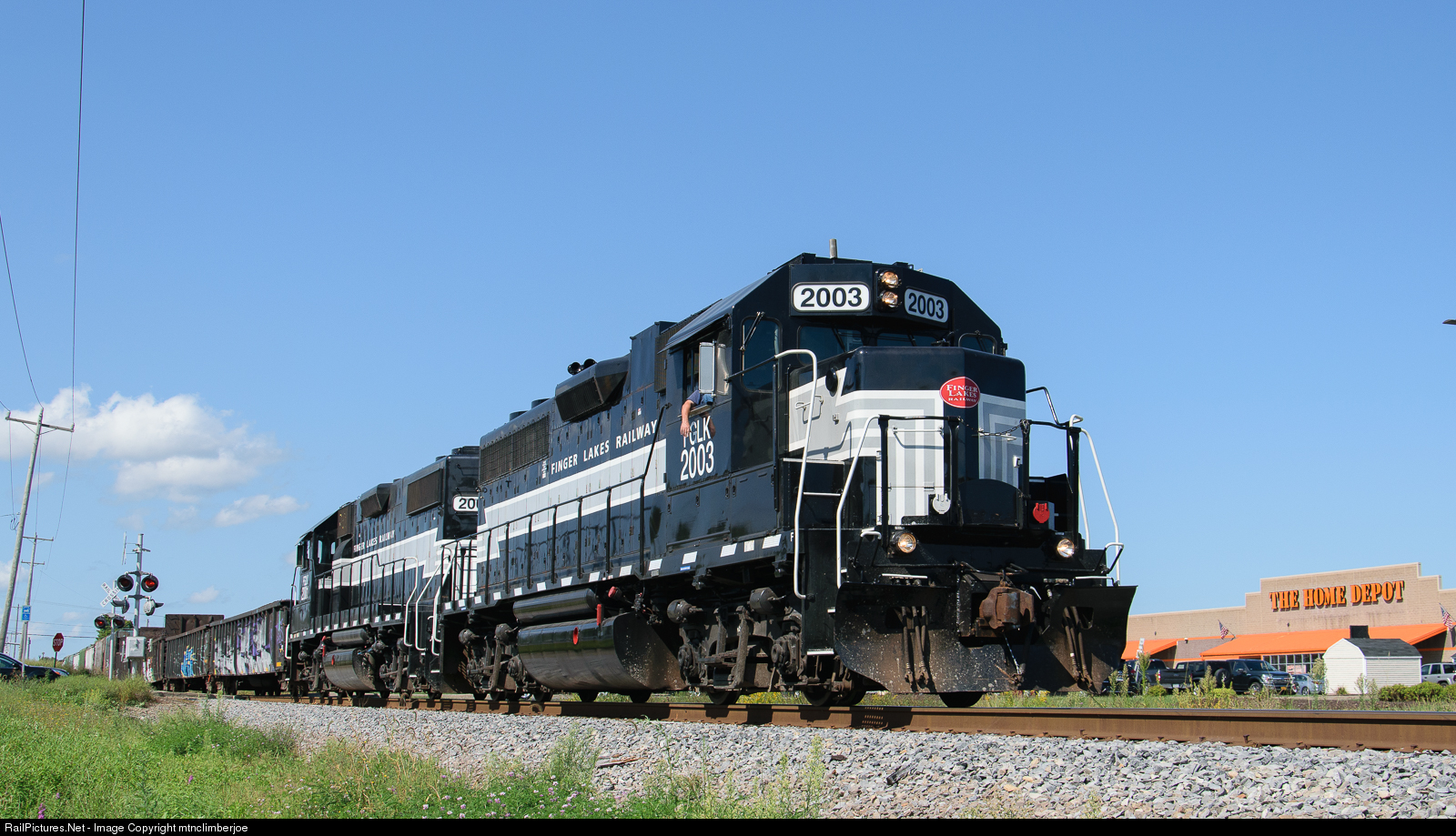 | A pair of Finger Lakes Railway GP38-2's leads GS-2 as they head towards Solvay, passing by a Home Depot in Fairmount, New York. |