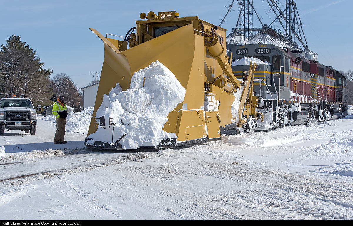 Iowa Northern was cautious at every grade crossing while plowing this line as the line had been closed for days. At each crossing a loader scrapped across and a MOW worker watched the plow trucks.