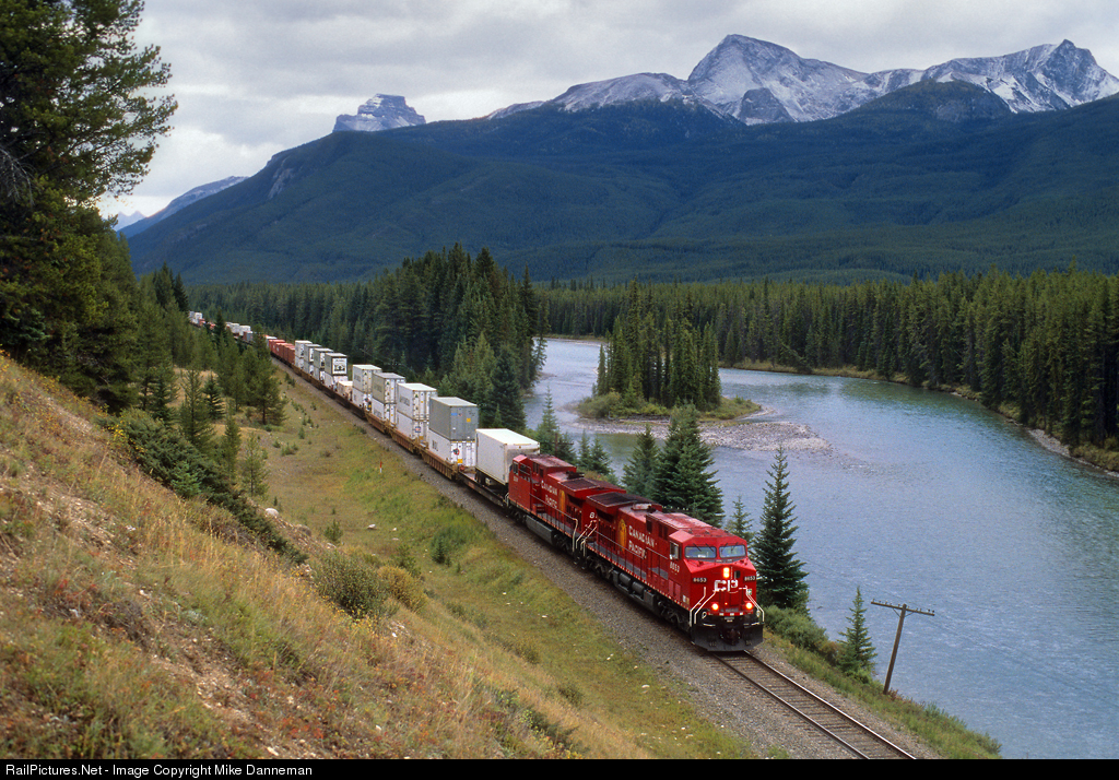 On the morning of September 20, 2002, a westbound Canadian Pacific intermodal train flies along the Bow River in scenic Banff National Park at Castle Mountain, Alberta. A pair of GE AC4400CWs power the westbound, led by No. 8653, delivered new to the railroad in November 2001.