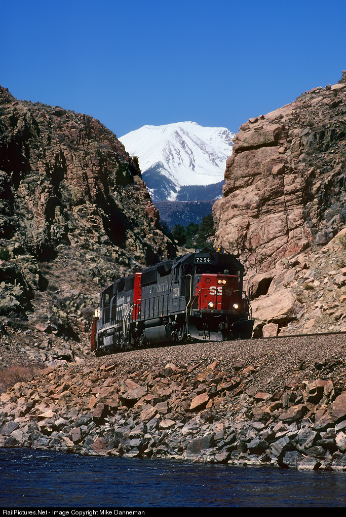 For a year-and-a-half after Union Pacific closed Colorado’s Tennessee Pass as a through route on August 23, 1997, it still operated a one-a-week local from Pueblo to Malta, near Leadville. On April 23, 1998, Cotton Belt GP40-2 No. 7254 leads the local along the Arkansas River between Vallie and Cotopaxi.