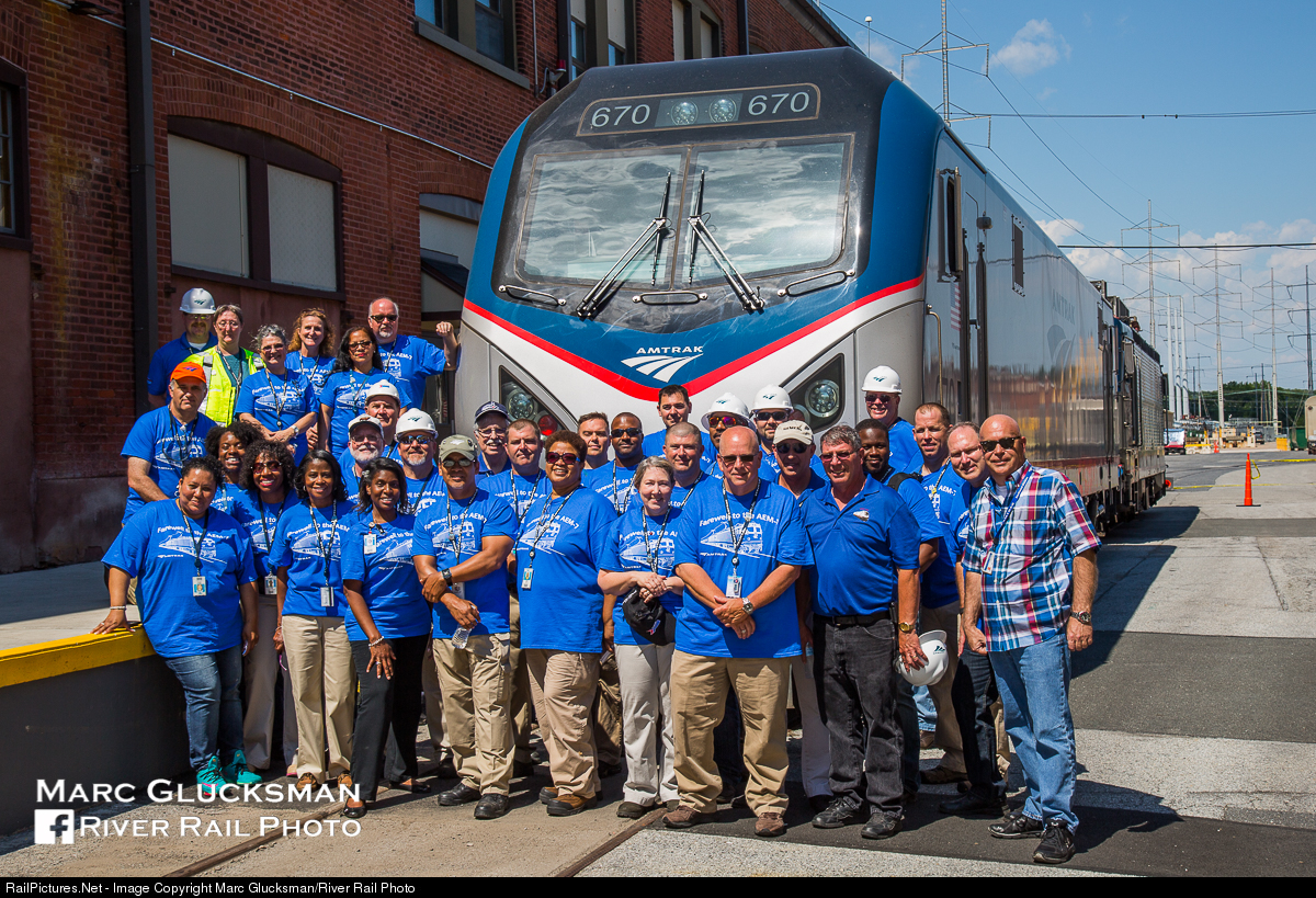Amtrak Siemens ACS-64 670 was the final unit of that order to be delivered. During the "Farewell To The AEM-7" excursion on June 18, 2016, the engine was displayed as part of a tour of the Wilmington facility. As usual, President Joseph Boardman poses with employees from the shop, but is hiding in the back row to allow the workers to be front and center.