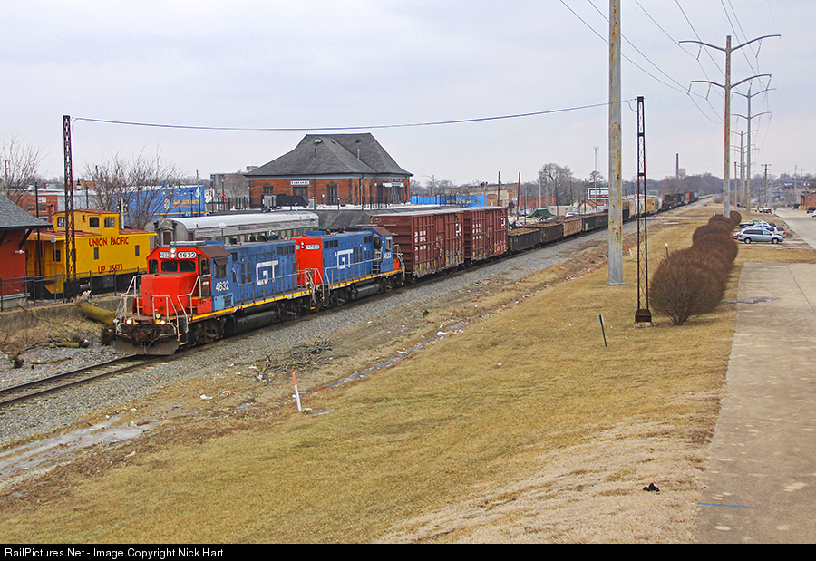 A pair of Grand Trunk GP9R's, both still wearing Trunk colors, lead the Kankakee local by the 1853-built Illinois Central depot in town. It's also passing the Railroad Museum outside of the depot. Five of these units remain in GTW paint, making this quite the catch in 2019.