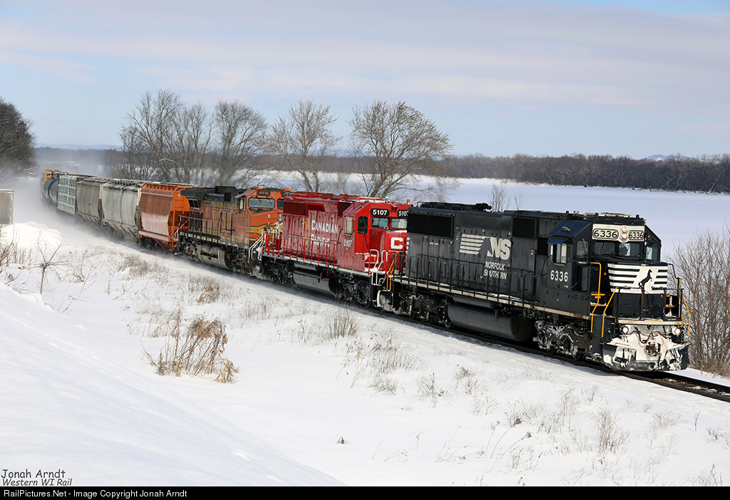 | NS 6336 leads a Colorful Consist through a cold and snowy, Dakota, MN |