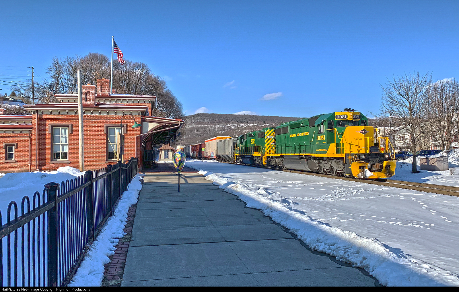 | RBMN's NRFF makes it's way back to North Reading from Jim Thorpe with a mixed selection of boxcars, reefers, and hoppers. Seen here passing the historic Tamaqua station. |
