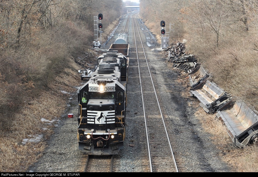 | Derailment Site. At approximately 11:30 am on Friday 3-8-19, for reasons unknown at this time, eight cars of fifty six car NS westbound train B08 derailed in rural La Porte county IN near milepost 460 on the Chicago Line. Thankfully there were no injuries and the eight coil cars were not loaded. Both eastward and westward mains sustained damage as the derailed cars came to rest at a perpendicular angle across both sets of tracks, while miraculously not taking out the nearby signals. The very professional and efficient work performed by Norfolk Southern and Cranemasters personnel enabled the line to be reopened and totally operational shortly after midnight on 3-9-19. Seen here is NS B08 heading east with five cars around noon on Saturday 3-9-19. Photo by Jeff Stupar |