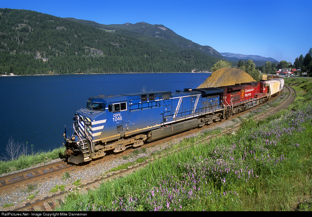 Blue CEFX GE AC4400CW No. 1046 leads a westbound Canadian Pacific freight along the shore of Moyie Lake at Moyie, British Columbia, on June 28, 2006. Over the years, CP has had long-term leases on quite a few locomotives from CEFX.