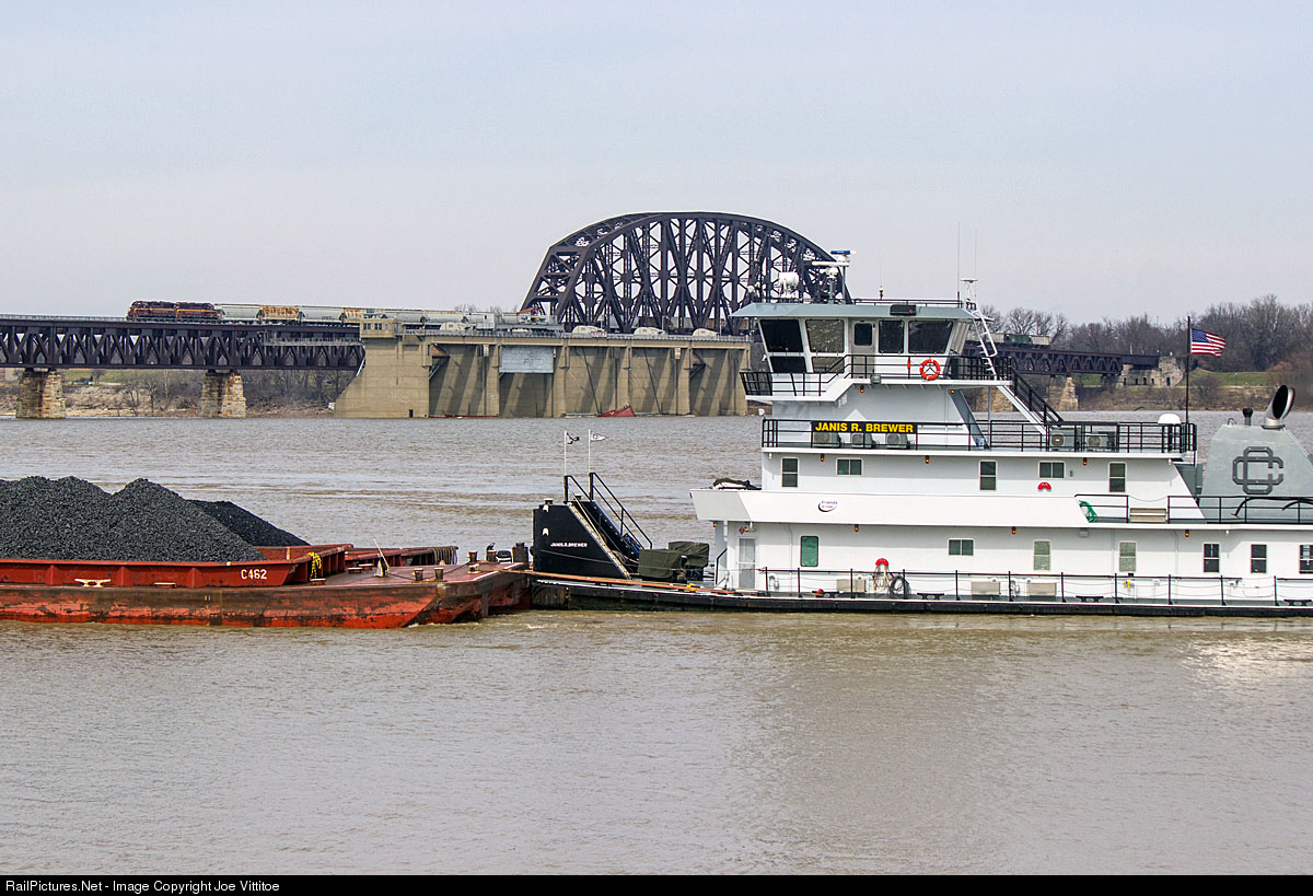 Southbound LIRC JXTR waits his turn to cross at Clagg as a loaded coal barge proceeds down stream on the Ohio.