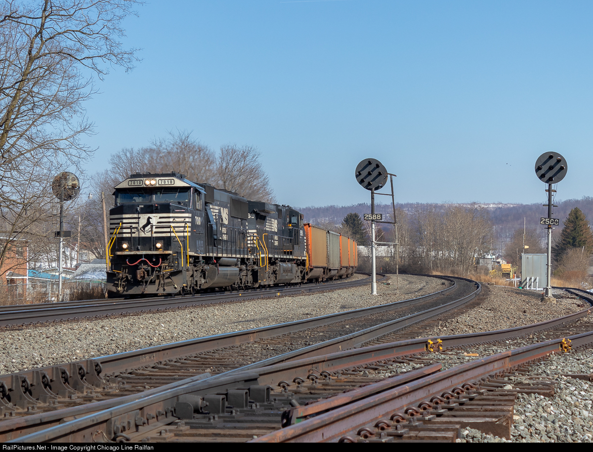 | On a sunny afternoon, NS #7010 leading NS 509 splits the Portage, PA intermediates. SD60E's are going to be the new SD60M/I's on these coal trains as they are being modified and put into regular service. Though I would like to see SD60M/I's, EMD's are better than GEVO's so I'll take them. NS is working their way west replacing and/or removing signals along the Pittsburgh Line. I'm glad I cleaned up on what is still left. |