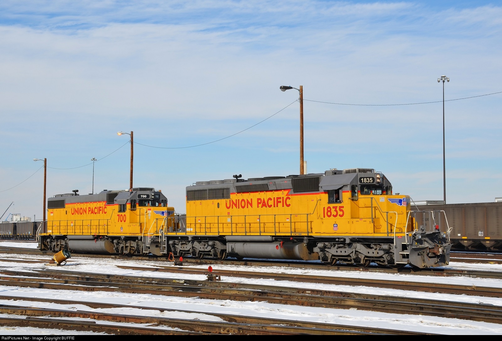 A relative newcomer to the UP's North Yard in Denver is UP 1835, a SD40R-2. It is teamed up with UP 700, a former Missouri Pacific GP38-2.