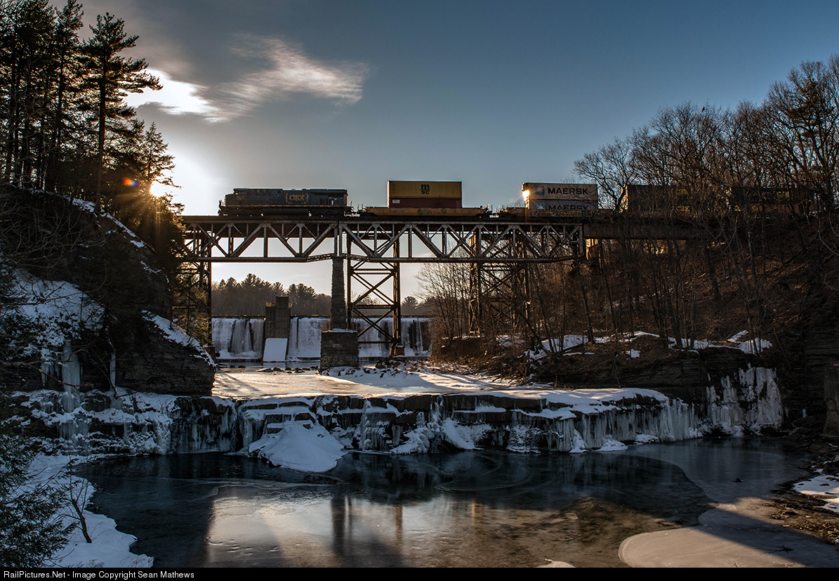 | A golden hour sun glints as a single ES44 carries an intermodal across French’s Hollow trestle on the outskirts of Schnectady, NY. Winter is still very much present on the iced over river. |