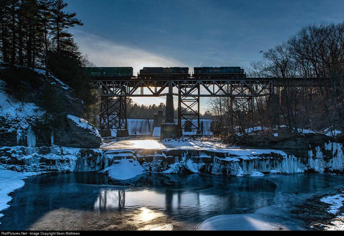 Last of my shots from weekend Reserve duty up in Schenectady. In this shot, CSX "Heritage Sticker" unit 5461, with Seaboard Coastlines herald, trundles across French's Hollow bridge. The setting sun peaks out from behind the trestle, casting reflections on the frozen falls and river below.