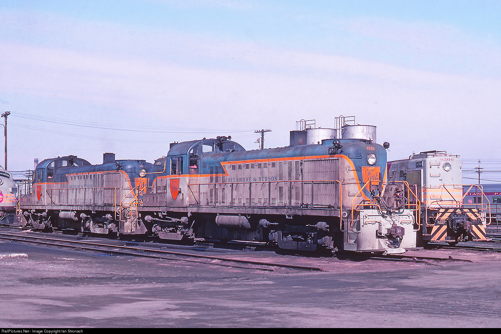 Despite the D&H having four PA-1's and four borrowed EL E-8's to cover its passenger trains between Albany, NY and Montreal in the winter occasionally the very road weary RS-2's would be pressed into service. The 4005 and 4022, off the overnight "Montreal Limited", lay over in the CPR's Glen Yard.