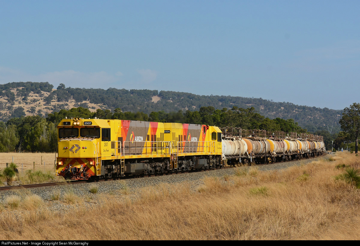 | With the Collie River bridge closed for the week, Alcoa has diverted some of its caustic and alumina trains from Bunbury to Kwinana. One such movement, near North Dandalup, saw P2507 & P2504 team up to work 3234 empty caustic from Yalup Brook to Kwinana. |