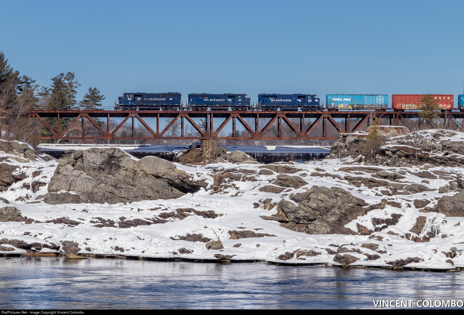 Pan Am Rumford-Portland freight crossing the Androscoggin River in Auburn, ME with MEC 507 (GP40-2LW) leading.