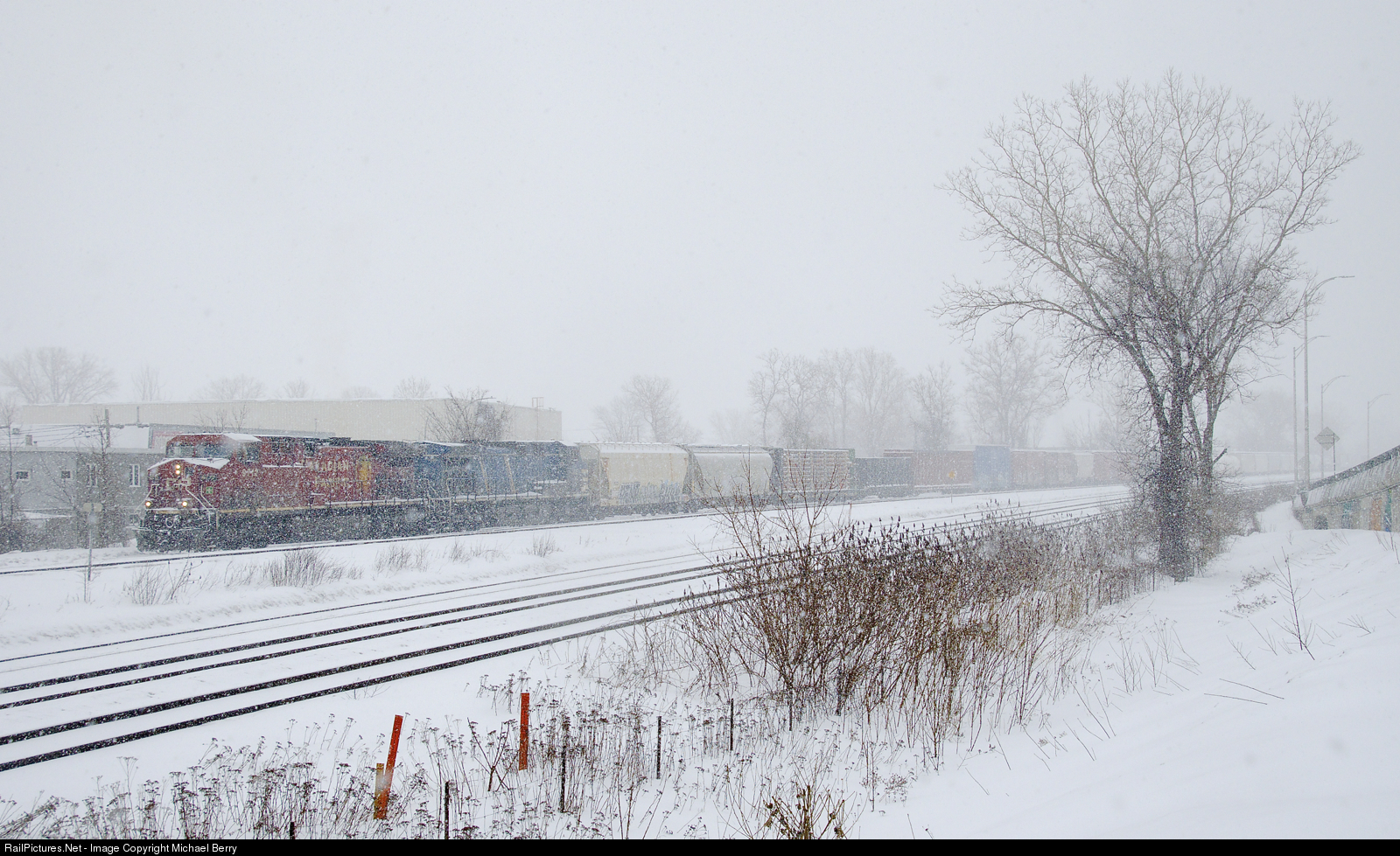 | Traffic on CP in Montreal has been on the rise, and CP has started running Montreal-Winnipeg train CP 219. Here it slowly approaches Dorval in the driving snow, where the conductor will get onboard. This train has CP 9712 and CEFX 1035 for power and 146 cars. |