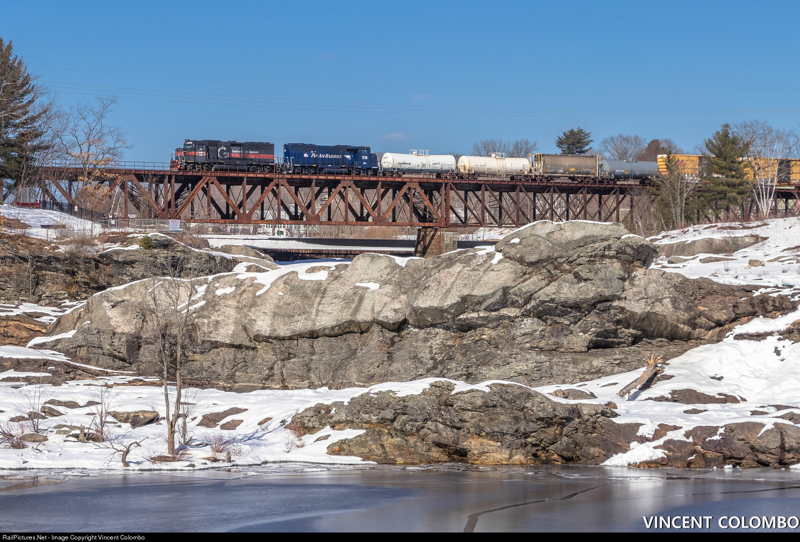 Pan Am Rumford-Portland freight crossing the Androscoggin River in Auburn, ME with BM 330 (GP40) leading.