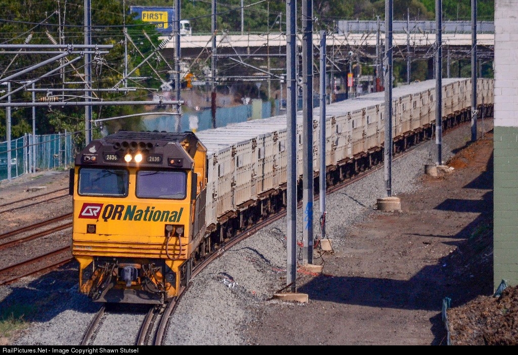 | Aurizon/QR National's 2836 powers through Rocklea, Brisbane with Empty Cattle Wagons on Transfer from Acacia Ridge Yards to Clapham Yards, as Train YF36... |