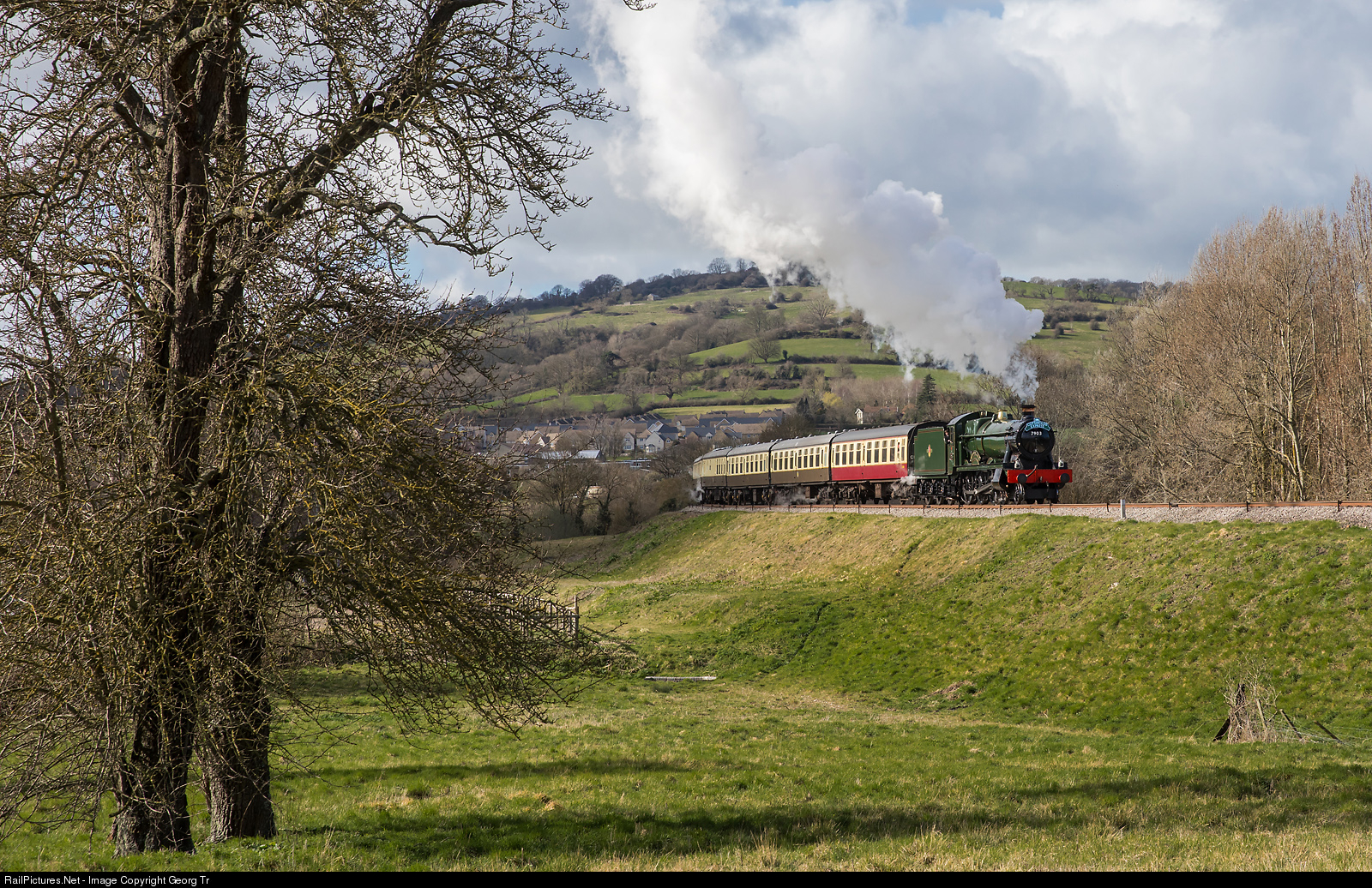 4-6-0 # 7903 "Foremarke Hall" is pulling the northbound "GWR COTSWOLDS EXPRESS" from Cheltenham Race Course to Broadway on the Gloucestershire and Warwickshire Railway (GWR) between Winchcombe and Toddington. From the GWR Website: