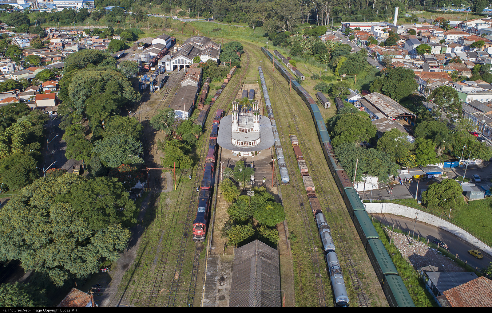 | Overview of Mairink yard and maintenance facilities, with a variety of equipment. At the center of the frame, the distinguishing structure is the station, that was the first one in brazil built using reinforced concrete. |
