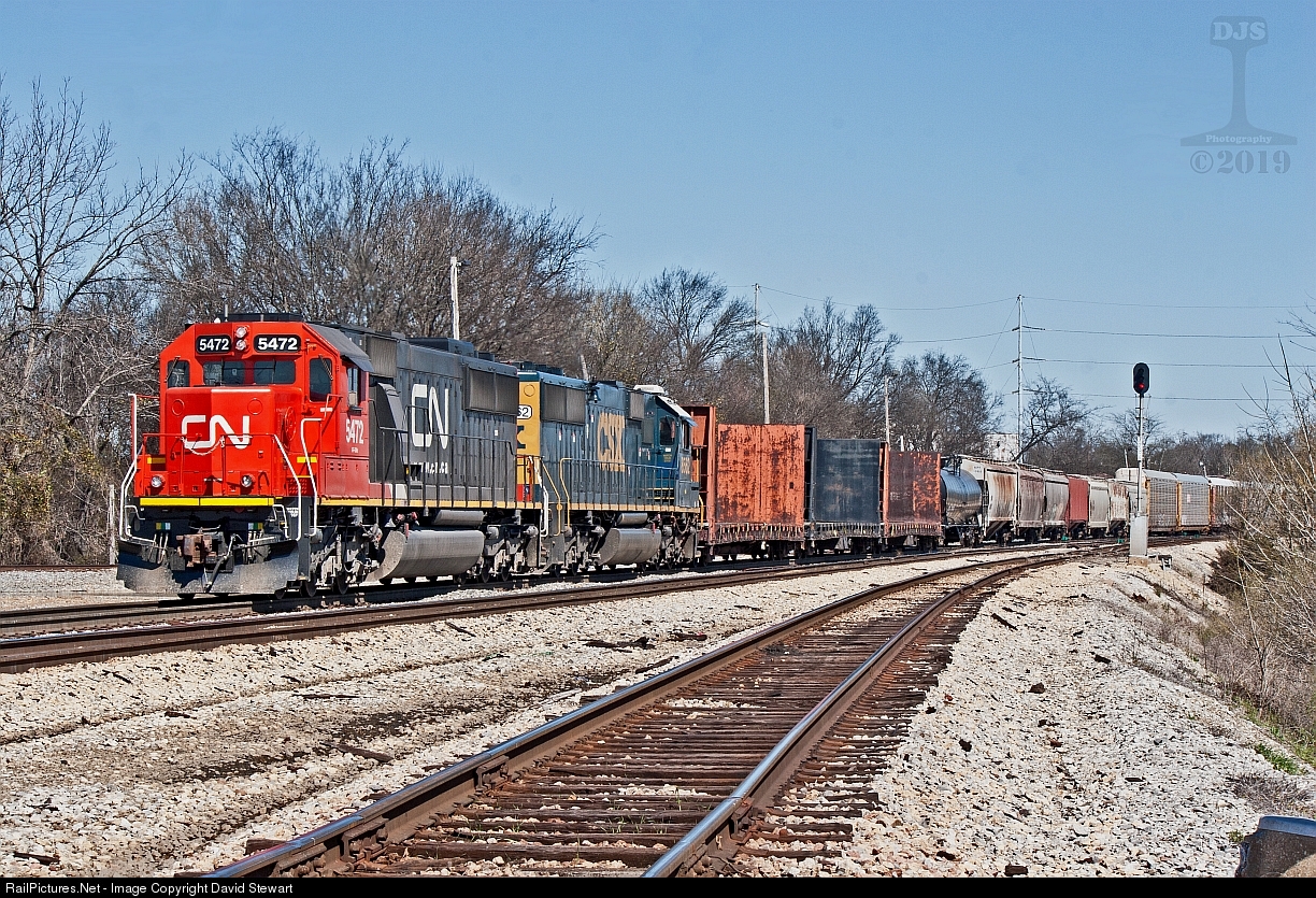 | CN SD60 5472 leads CSXT SD50 8562 on a southbound from Jackson, Mississippi on March 13, 2014. |